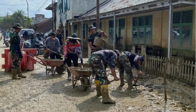 Dengan mengerahkan tenaga serta perlengkapan seperti cangkul, sekop, selang air, dan berbagai alat kebersihan lainnya, para prajurit bahu-membahu membersihkan setiap sudut area sekolah. Mulai dari halaman, selokan, ruang kelas, hingga fasilitas umum lainnya dibersihkan dari lumpur dan sisa material banjir. Kegiatan tersebut dilakukan secara bertahap dan terkoordinasi agar hasil pembersihan dapat maksimal.